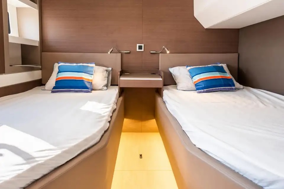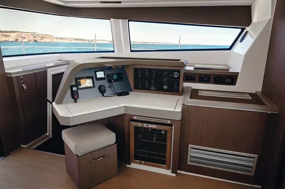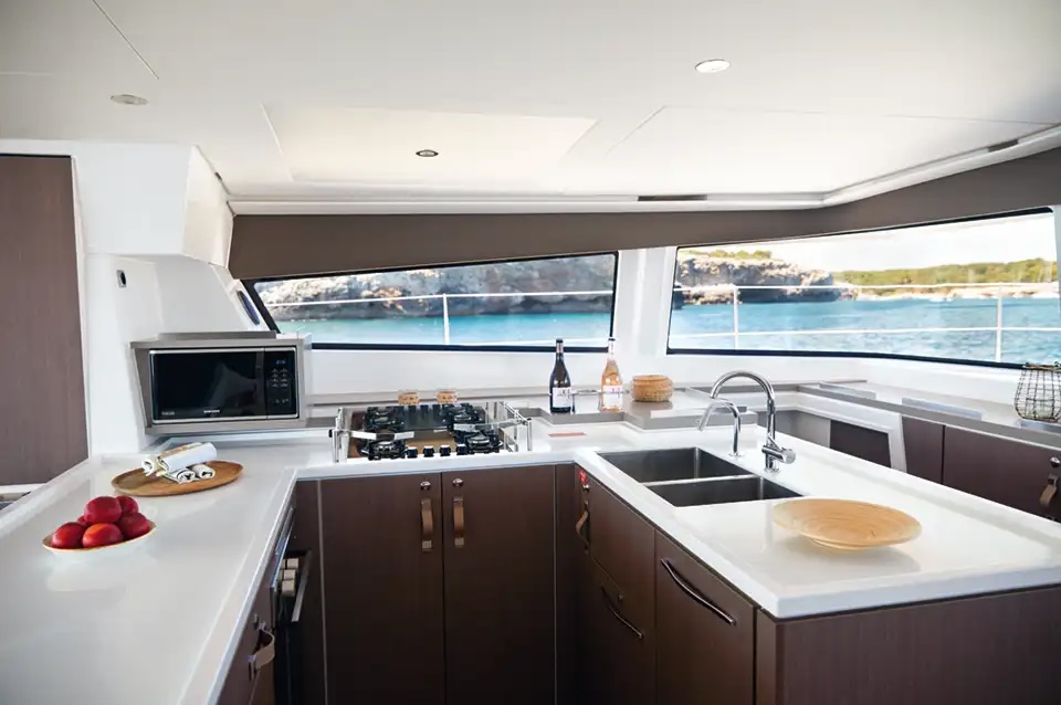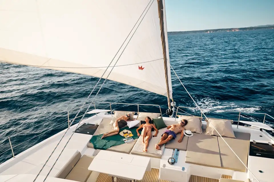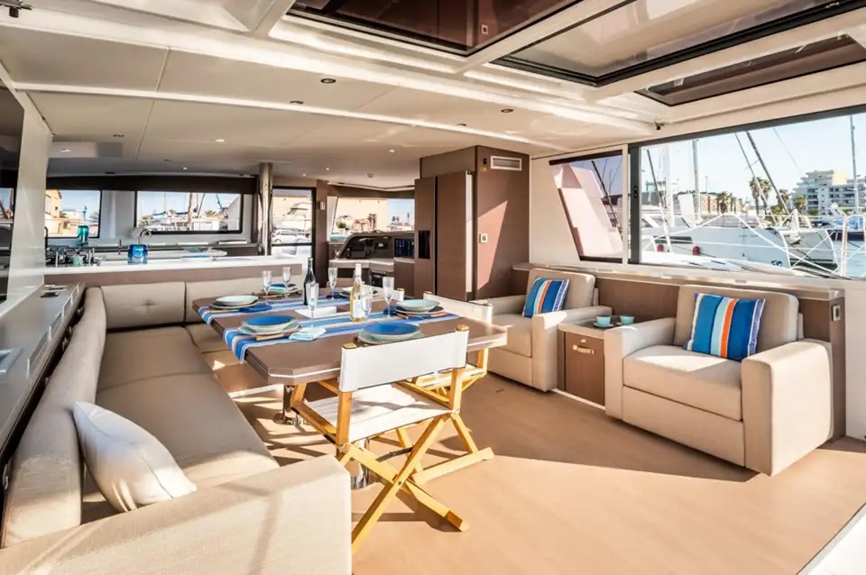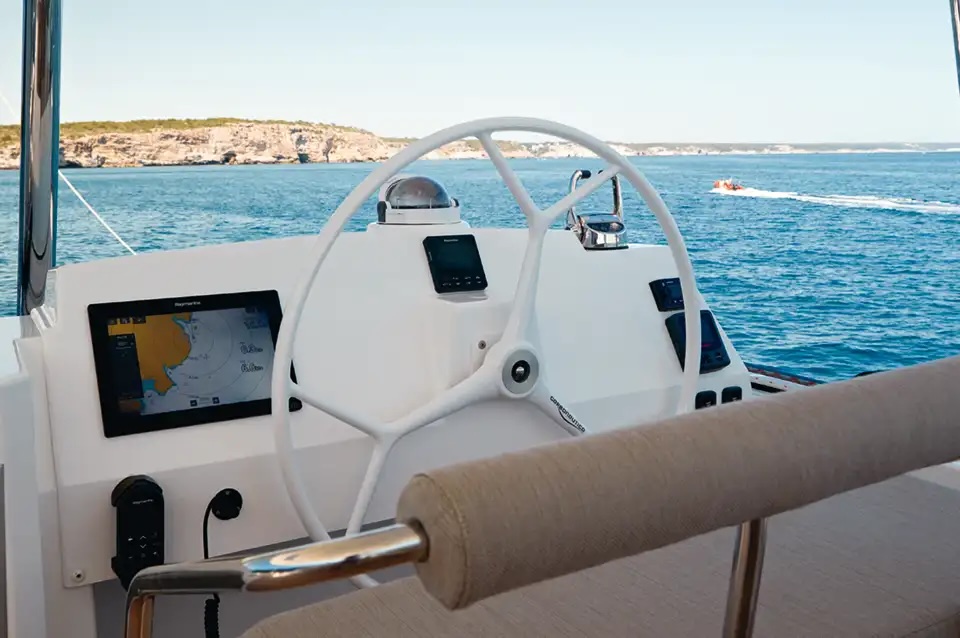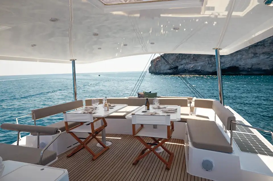 The top deck is partially shaded, with a spacious cockpit area and a seating lounge near the helm. The overall design prioritizes open spaces, visibility, and comfort, making this catamaran suitable for leisure and cruising. The surrounding landscape shows a coastal area with mountainous terrain and buildings, likely near the Mediterranean, adding to the sense of luxury and relaxation the boat offers.