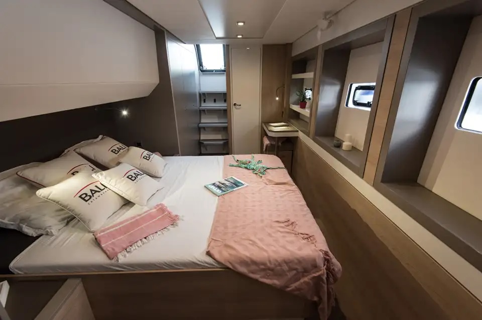 The boat in the image is a modern, luxurious catamaran, identified as the "BALI 5.4." It features a wide, open-deck design with spacious, squared-off hulls that provide stability and ample interior space. The boat has a sleek, white hull with long horizontal windows that offer expansive views from the inside. The sails are large and prominently set up, suggesting it's built for smooth sailing.