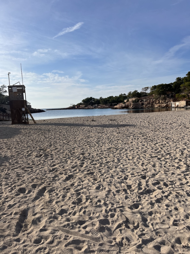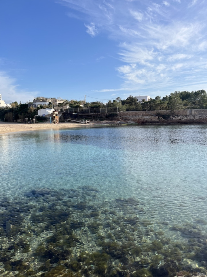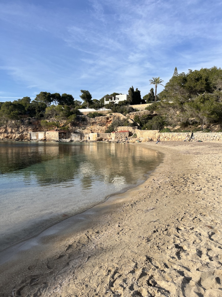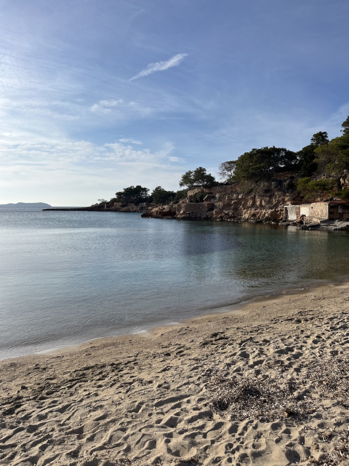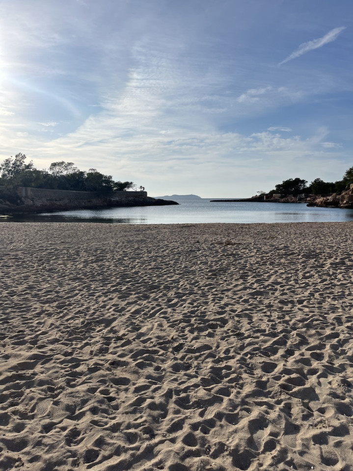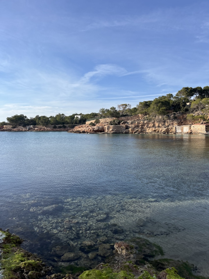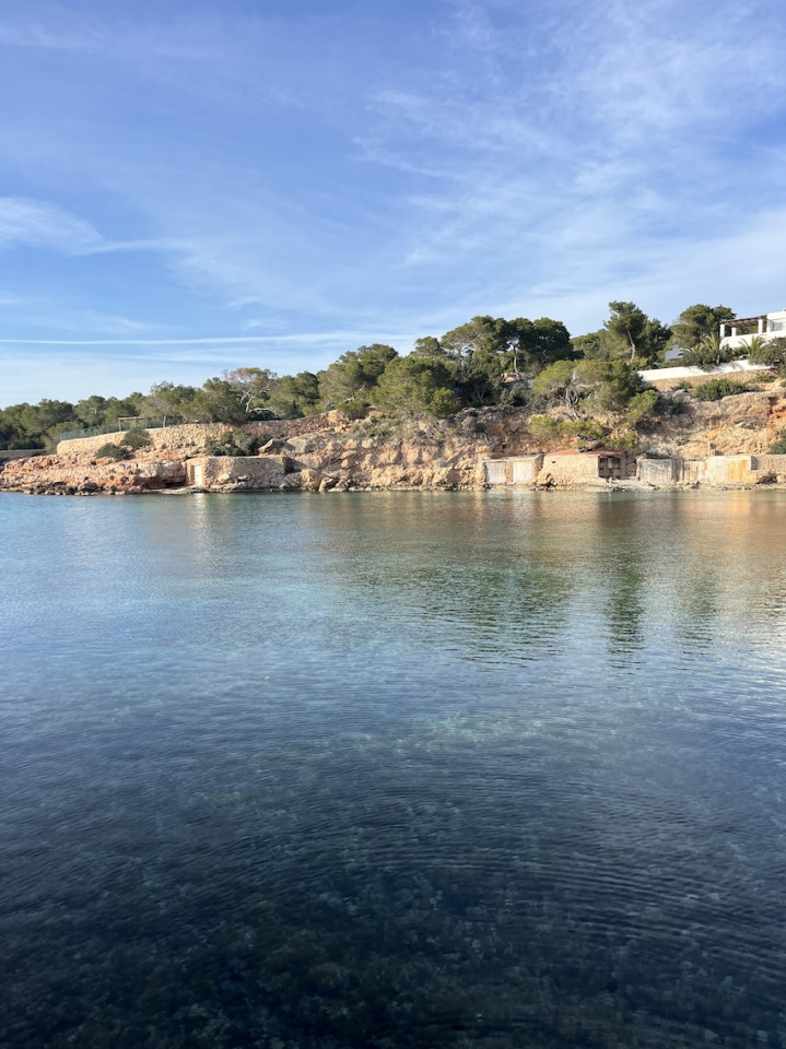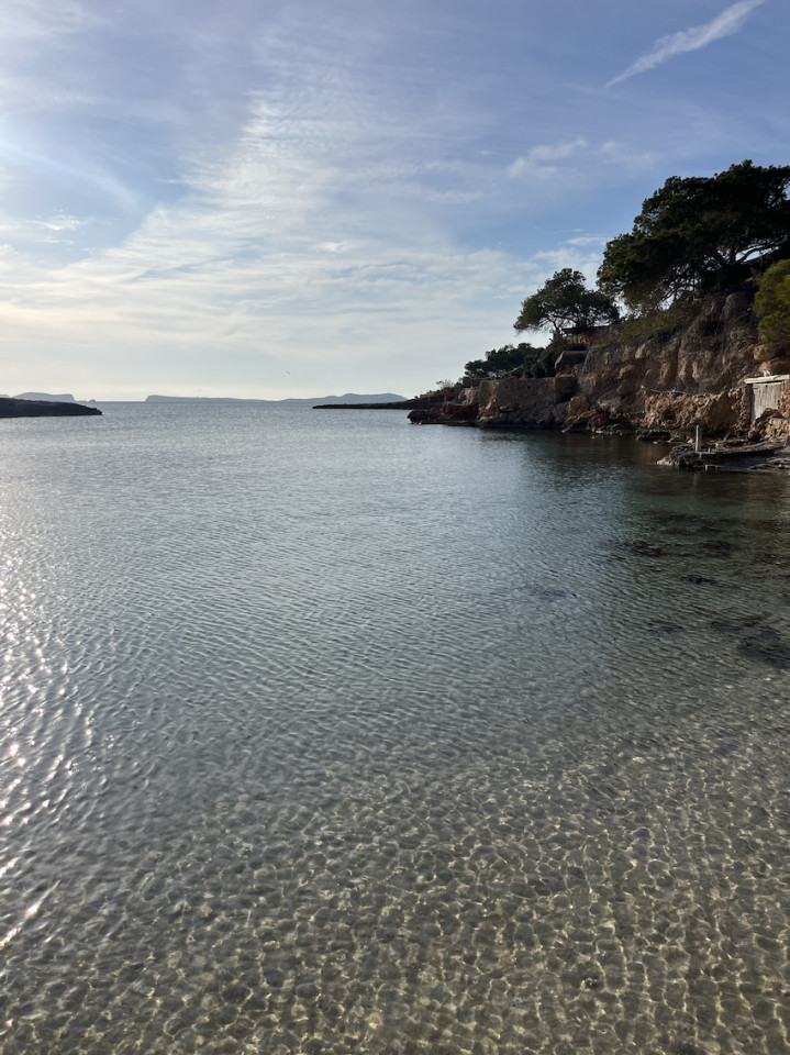 Cala Gració is a charming cove near San Antonio, Ibiza, known for its calm, turquoise waters and soft golden sand. Surrounded by lush pine trees and rocky cliffs, it offers a tranquil and picturesque setting, with shallow clear waters and stunning sea views.