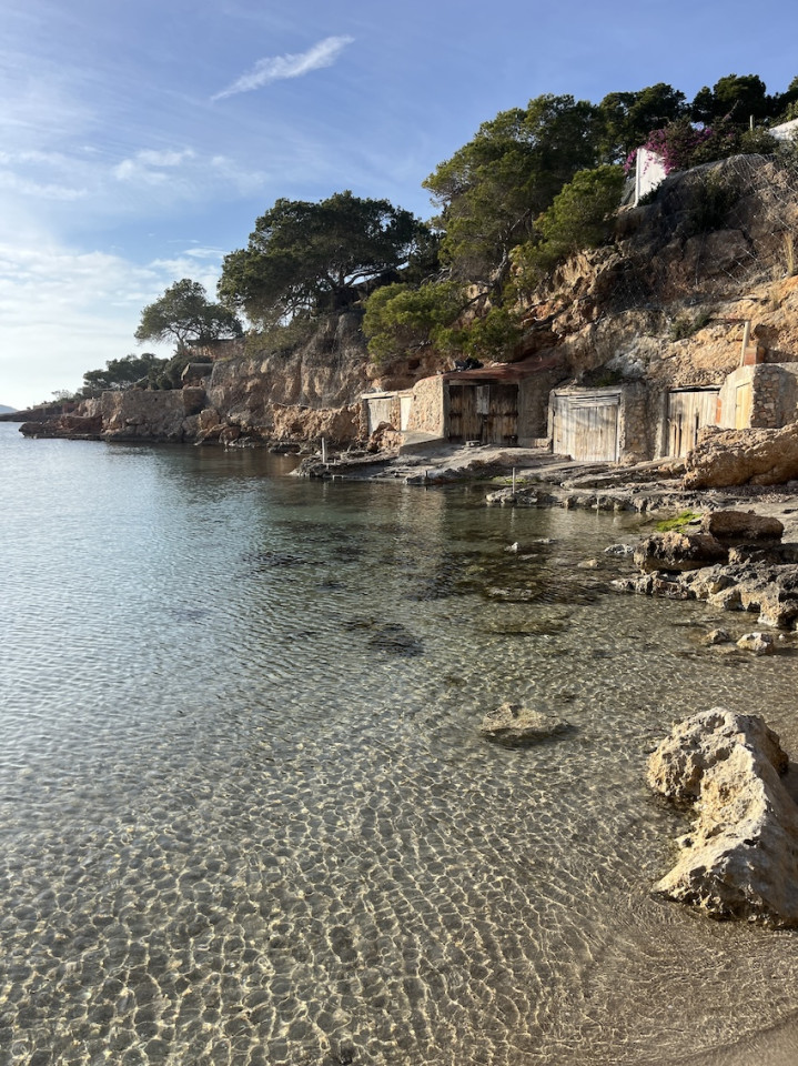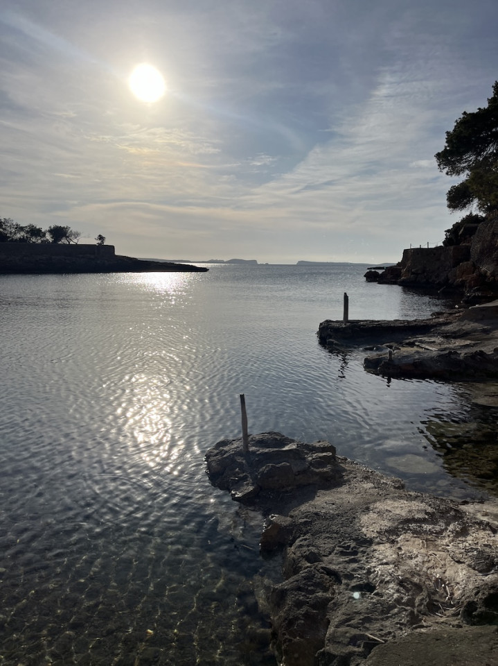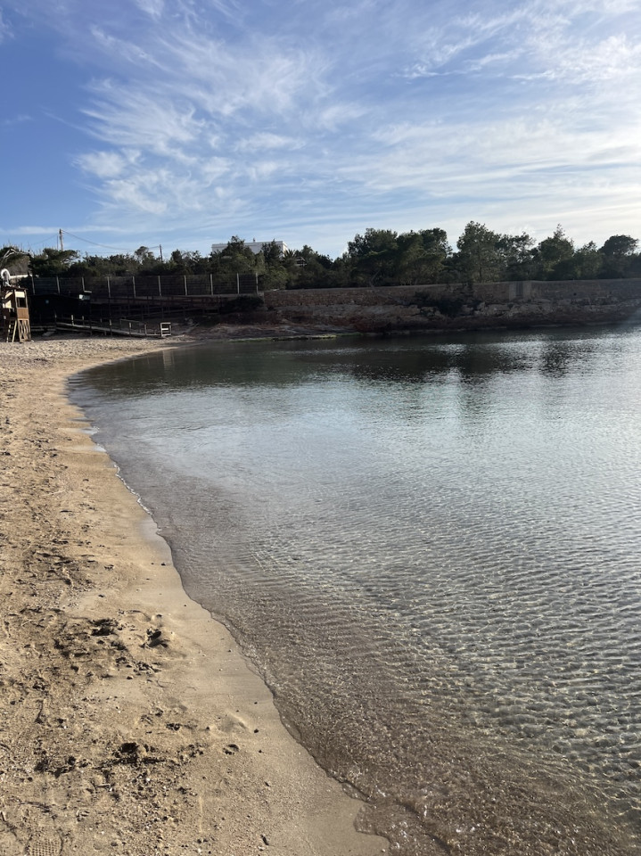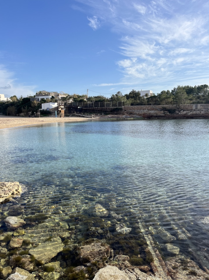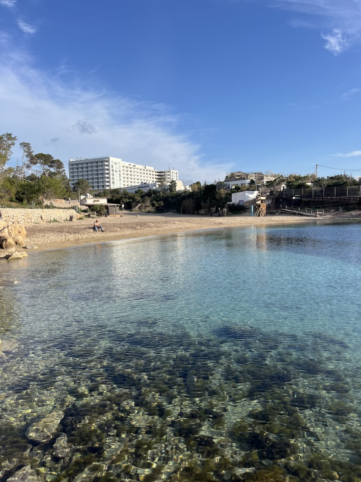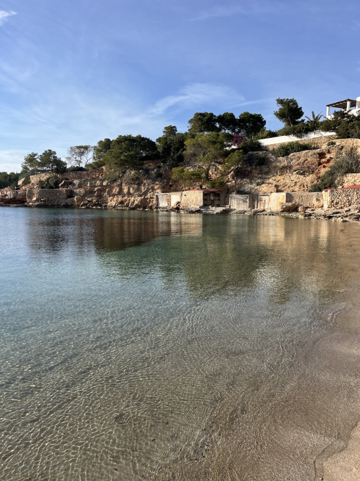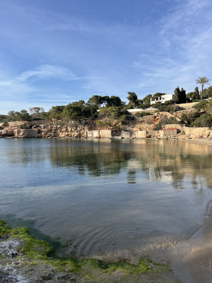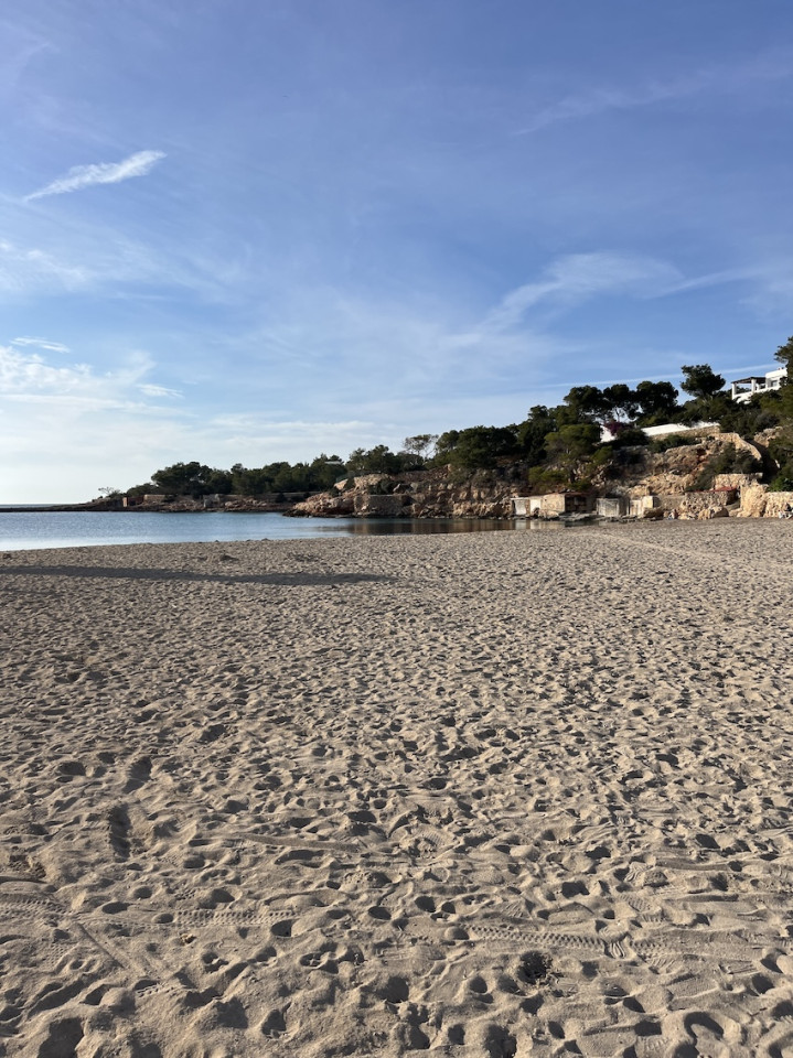 Cala Gració is a charming cove near San Antonio, Ibiza, known for its calm, turquoise waters and soft golden sand. Surrounded by lush pine trees and rocky cliffs, it offers a tranquil and picturesque setting, with shallow clear waters and stunning sea views.