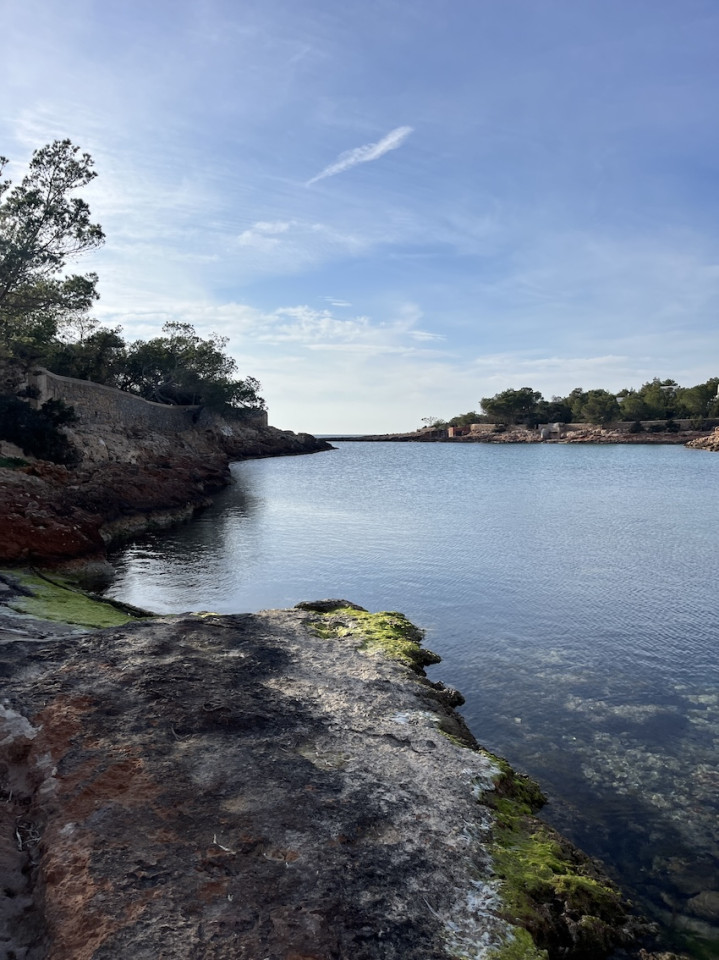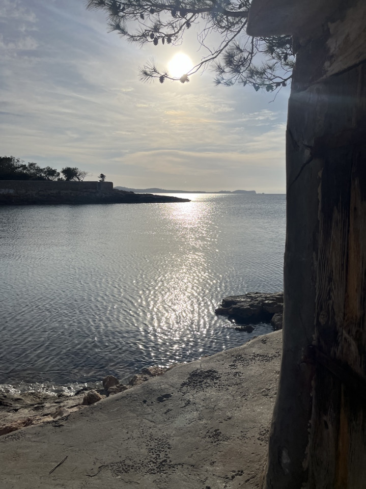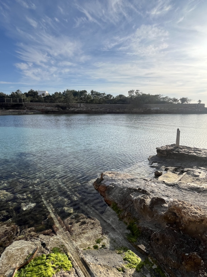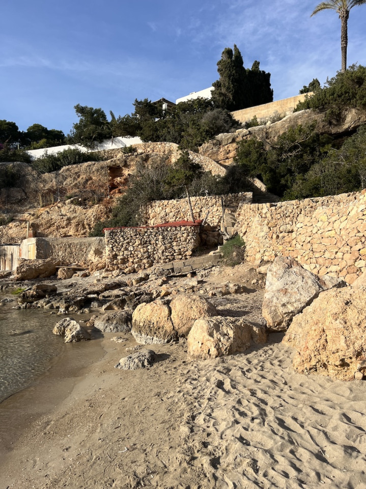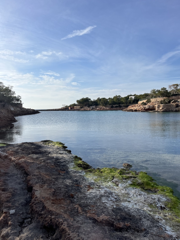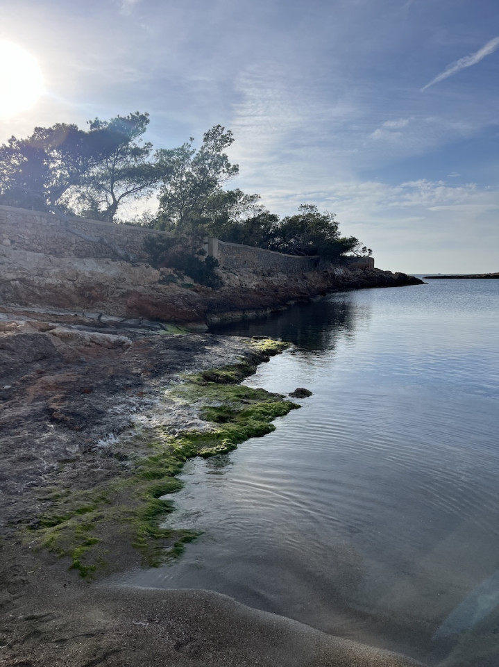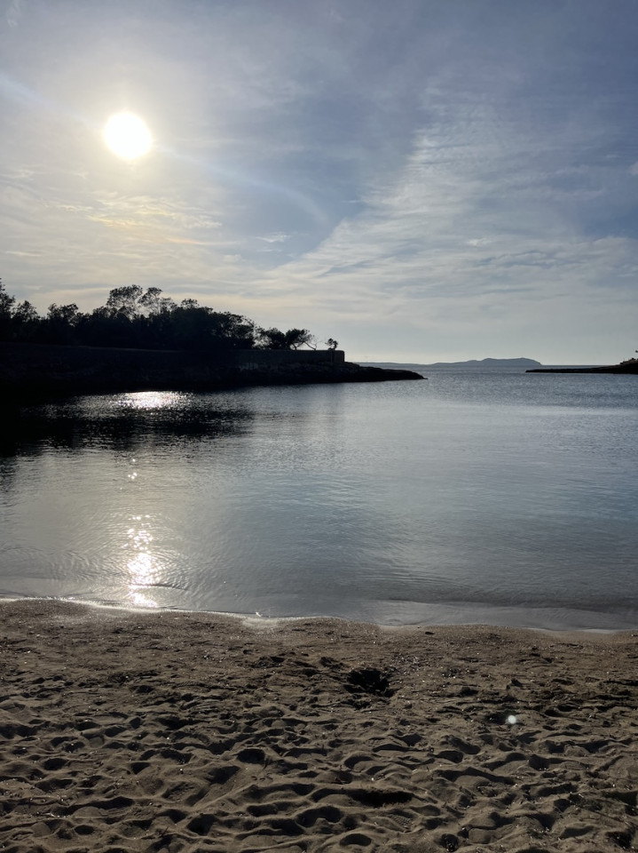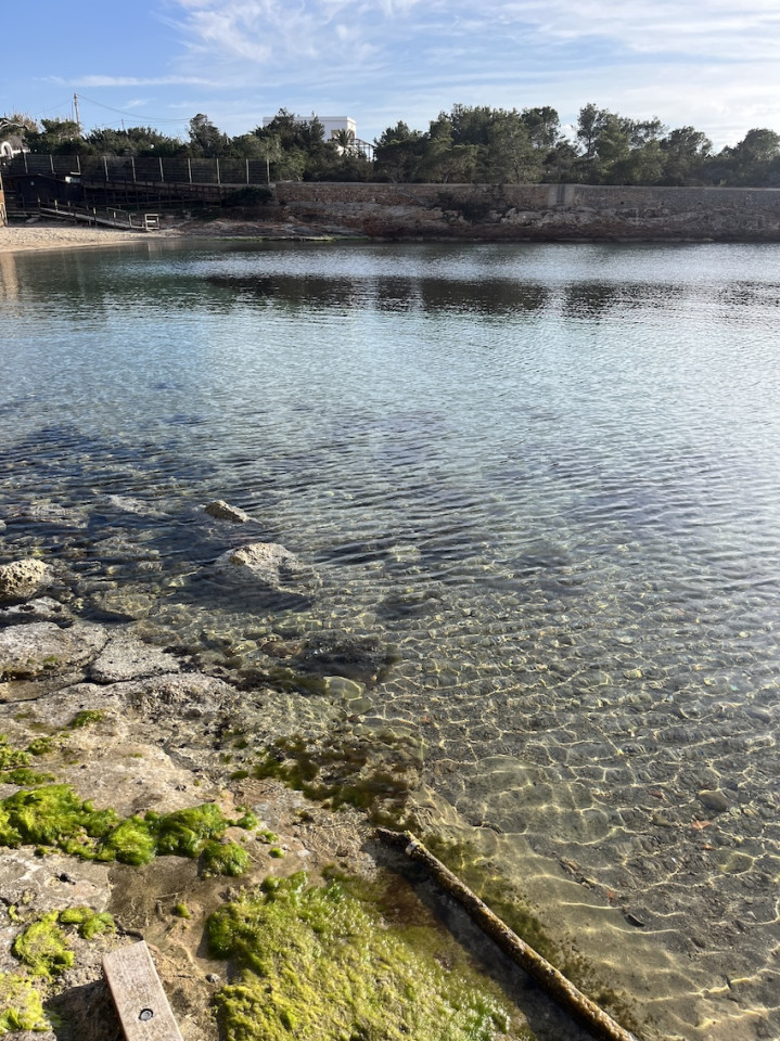 Cala Gració is a charming cove near San Antonio, Ibiza, known for its calm, turquoise waters and soft golden sand. Surrounded by lush pine trees and rocky cliffs, it offers a tranquil and picturesque setting, with shallow clear waters and stunning sea views.