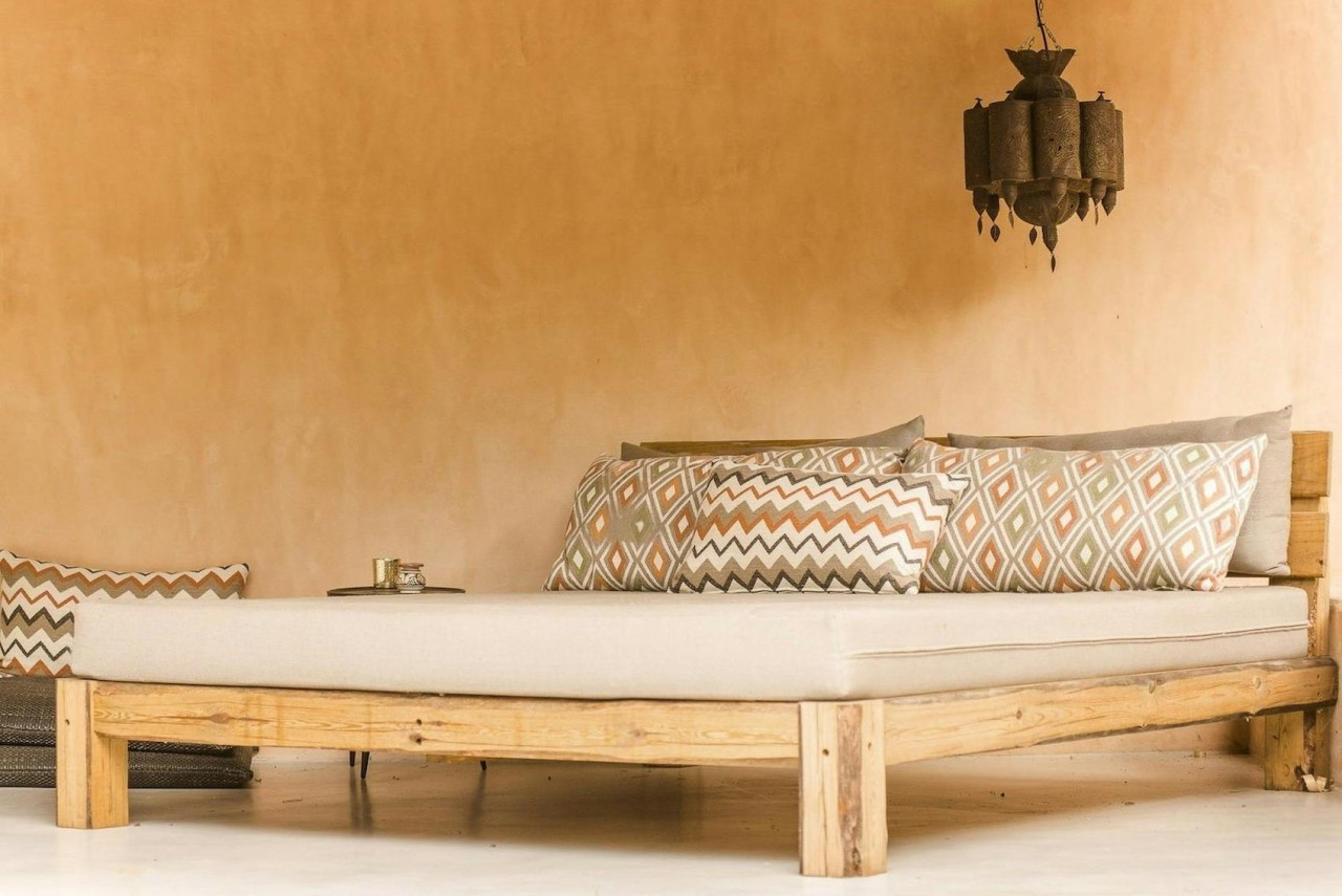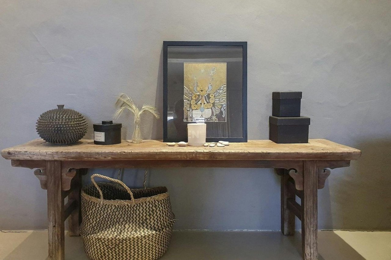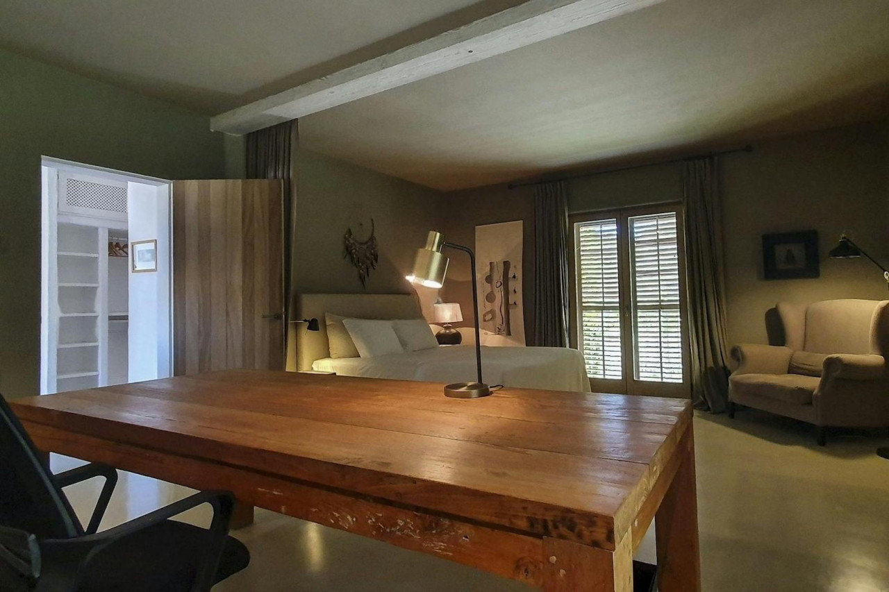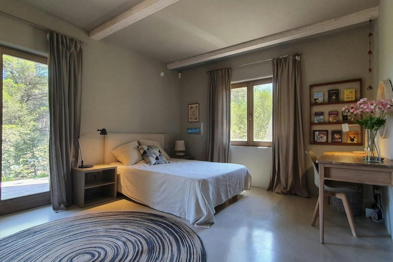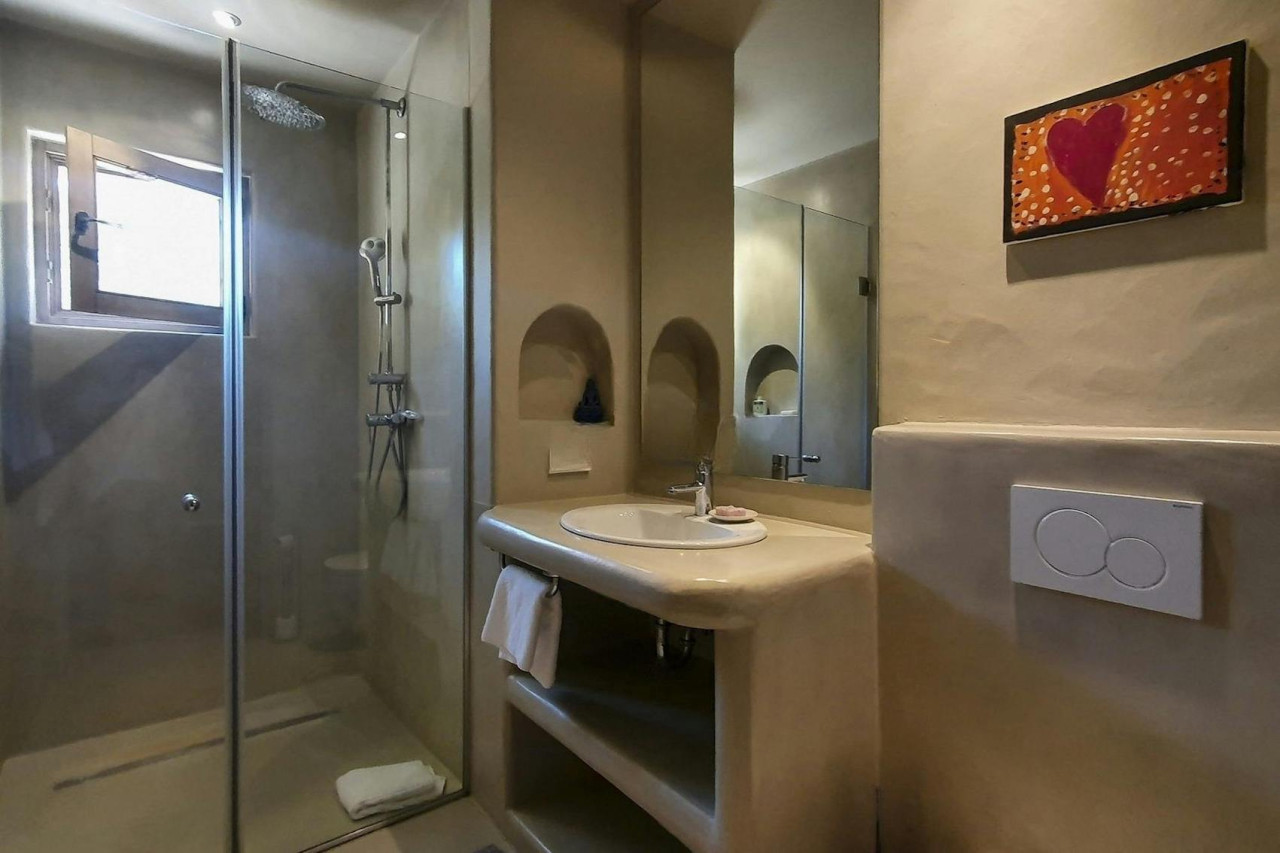 Minimalist and modern, with original stone walls and beamed ceilings, this relaxing villa is decorated in eggshell white hues and nature-inspired details, including live-edged wood furniture. ile olive and palm trees flank the pool terrace for anyone needing some shade from the summer sun.