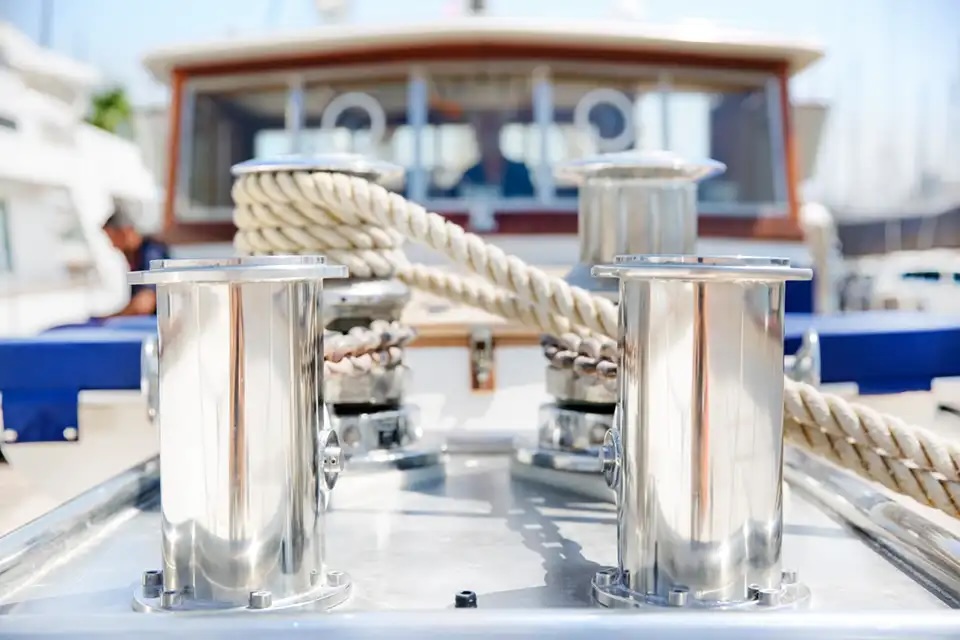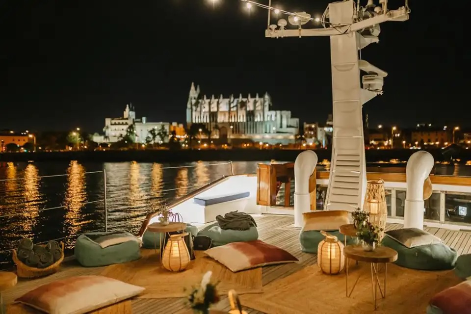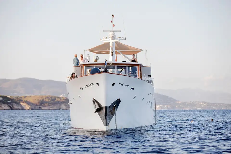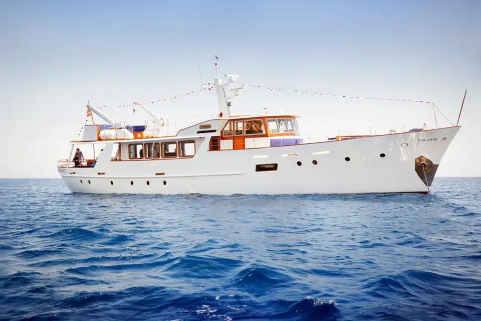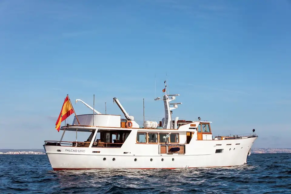 - The Falcao Uno is a classic, elegant motor yacht with a timeless white hull and a spacious, sturdy design. Large rectangular windows line the superstructure, flooding the interior with natural light, while the polished wood accents around the windows and on the deck add warmth and sophistication. The upper deck features an enclosed bridge with a navigation mast and modern radar equipment, blending vintage style with contemporary functionality. At the stern, there’s an open, partially shaded seating area for relaxing and enjoying the sea views, complete with a Spanish flag flying proudly. Overall, the *Falcao Uno* exudes vintage charm and refined luxury, perfect for leisurely, stylish cruising.