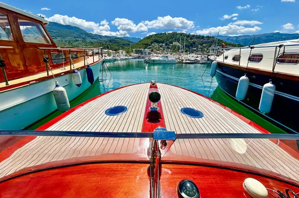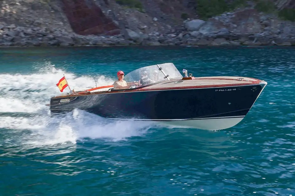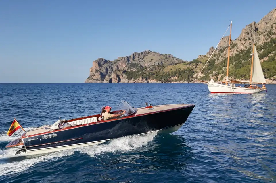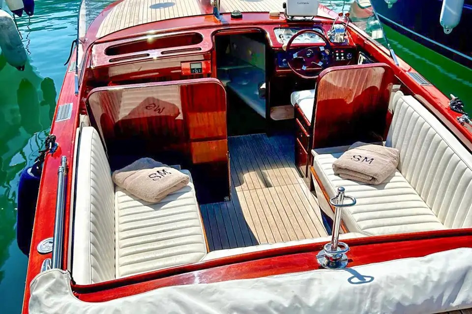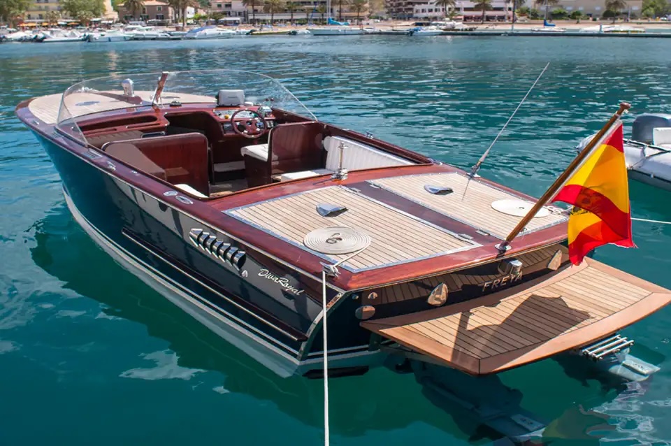 - This is a sleek, classic day cruiser with a deep navy-blue hull and a contrasting polished wooden deck, exuding timeless elegance. The open cockpit design features luxurious white upholstered seating, providing a comfortable and stylish space for passengers. The windshield is low and minimalist, enhancing the boat’s sporty yet refined appearance.