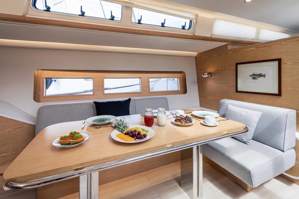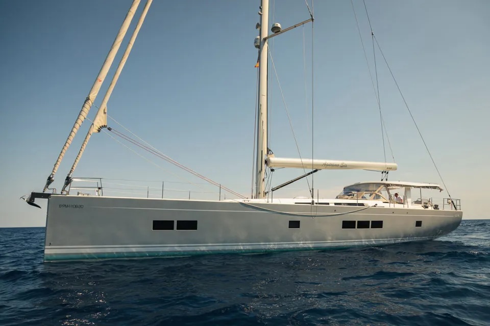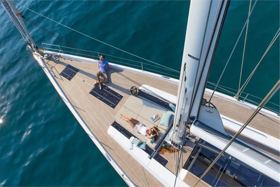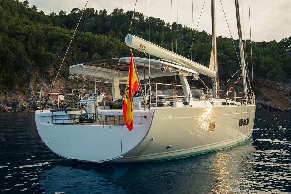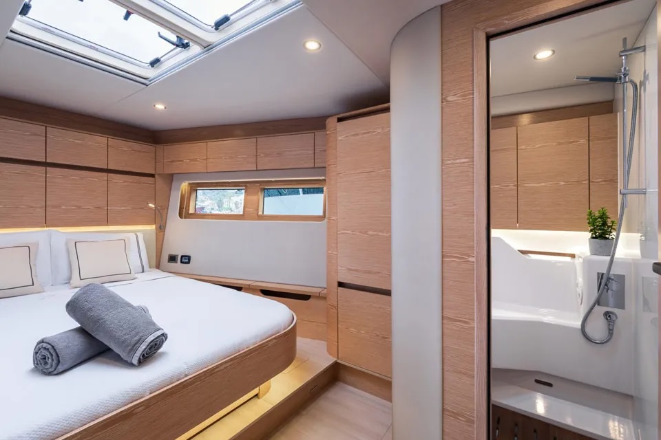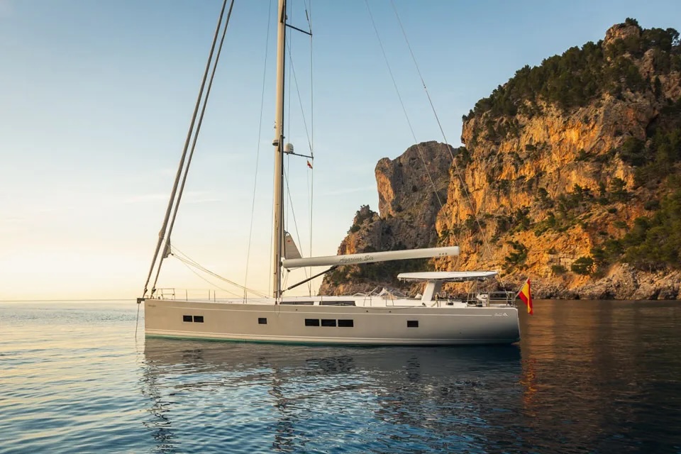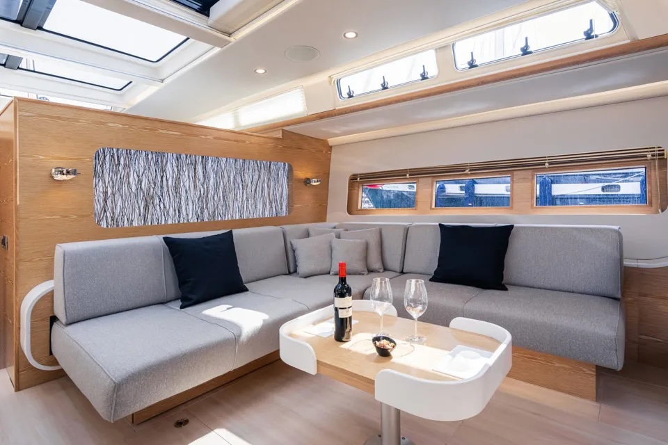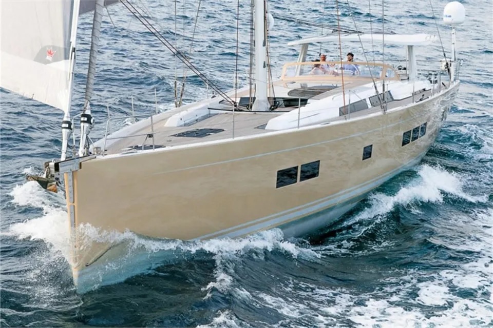 - A modern sailing yacht with a sleek beige hull, large rectangular windows, and a spacious deck layout designed for luxury and comfort. Its clean lines and minimalist aesthetic emphasize elegance and contemporary design.