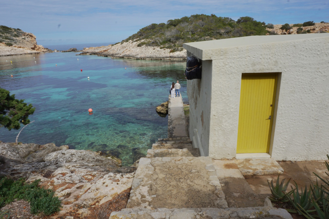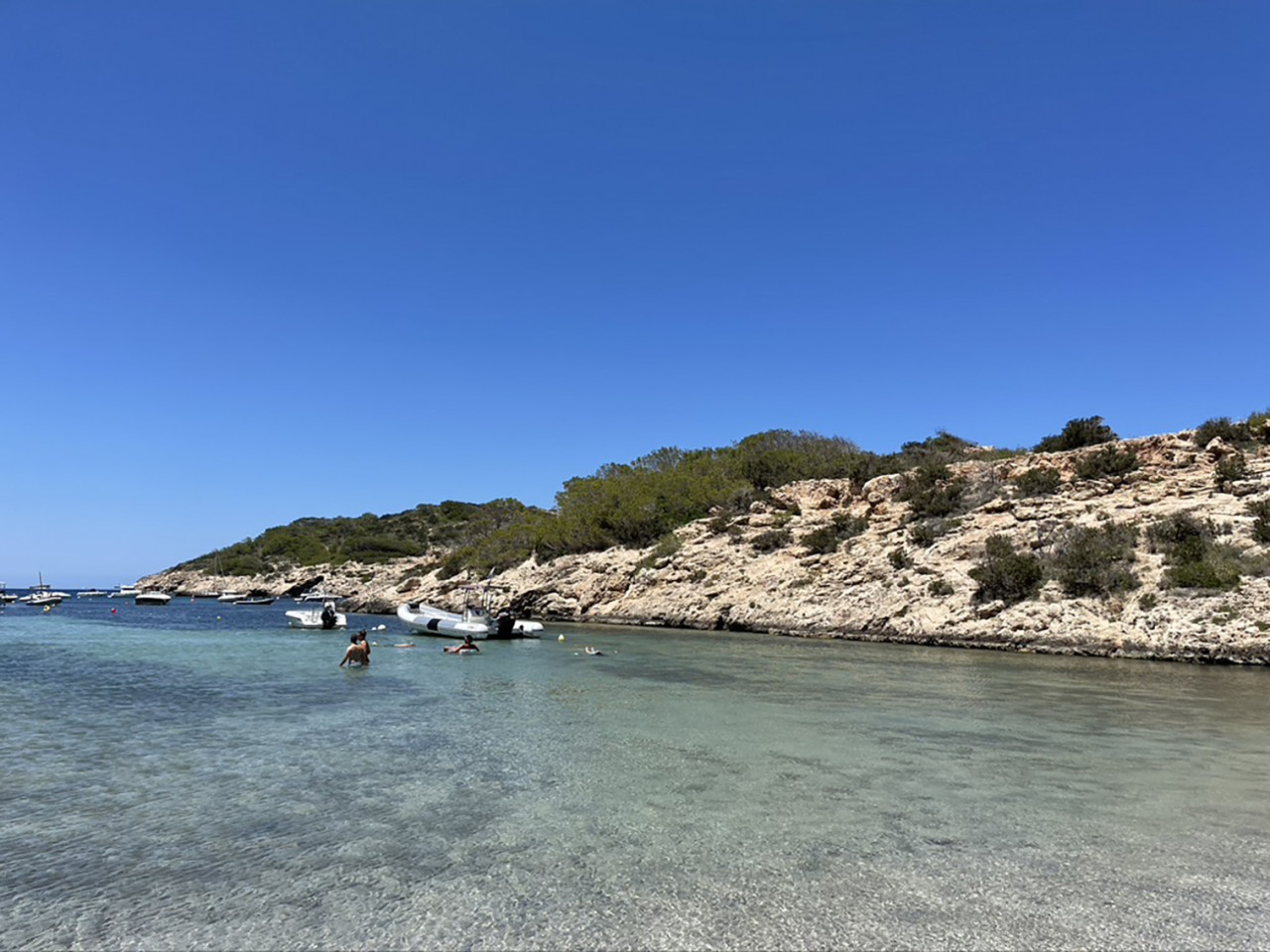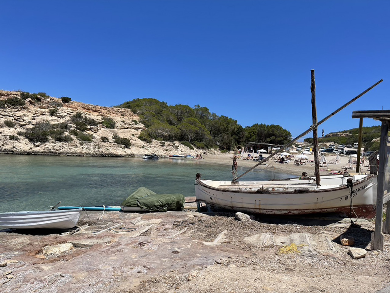 Located in the northern part of Ibiza, this coastal area features clear turquoise water, soft golden sand, and shallow bathing zones. The bay is framed by gentle hills and Mediterranean vegetation, creating a contained shoreline with open views toward the sea. The beach itself is relatively compact, with calm waters and a gradual entry into the sea. The surrounding landscape of low hills and greenery forms a natural backdrop, while the sandy shoreline and shallow water provide a clean coastal setting.