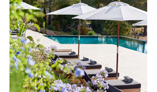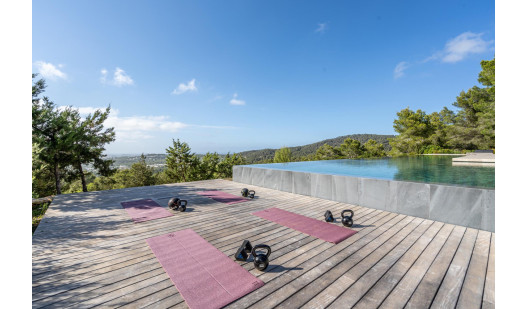 Follow the deck around the perimeter of the plot and you?ll discover peaceful chill-out spots overlooking the blue Balearic sea. On an upper terrace, a wooden roof shelters an al-fresco dining space, seating eighteen, with beautiful sea views.