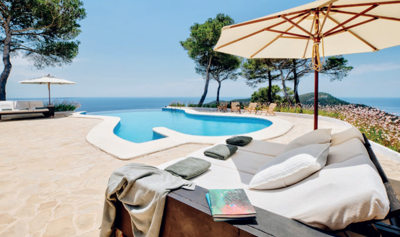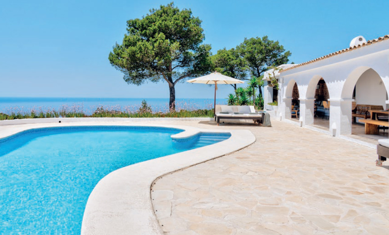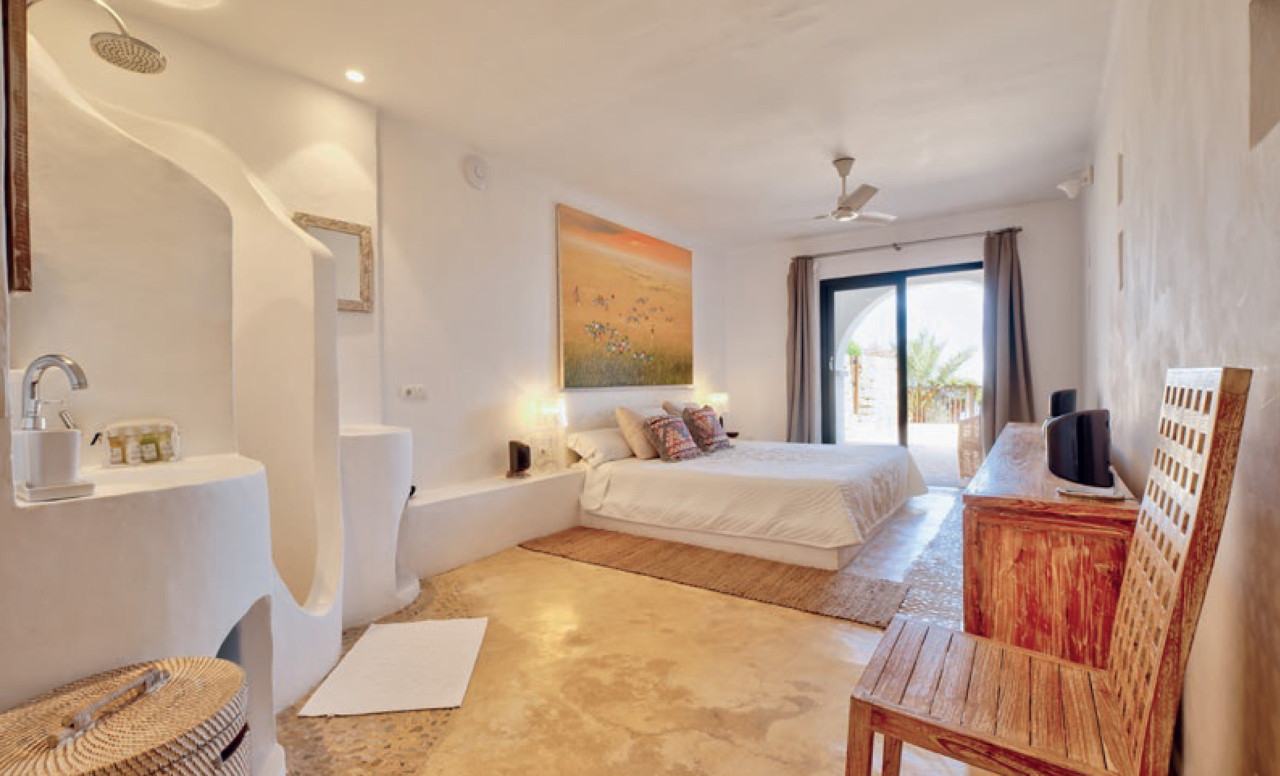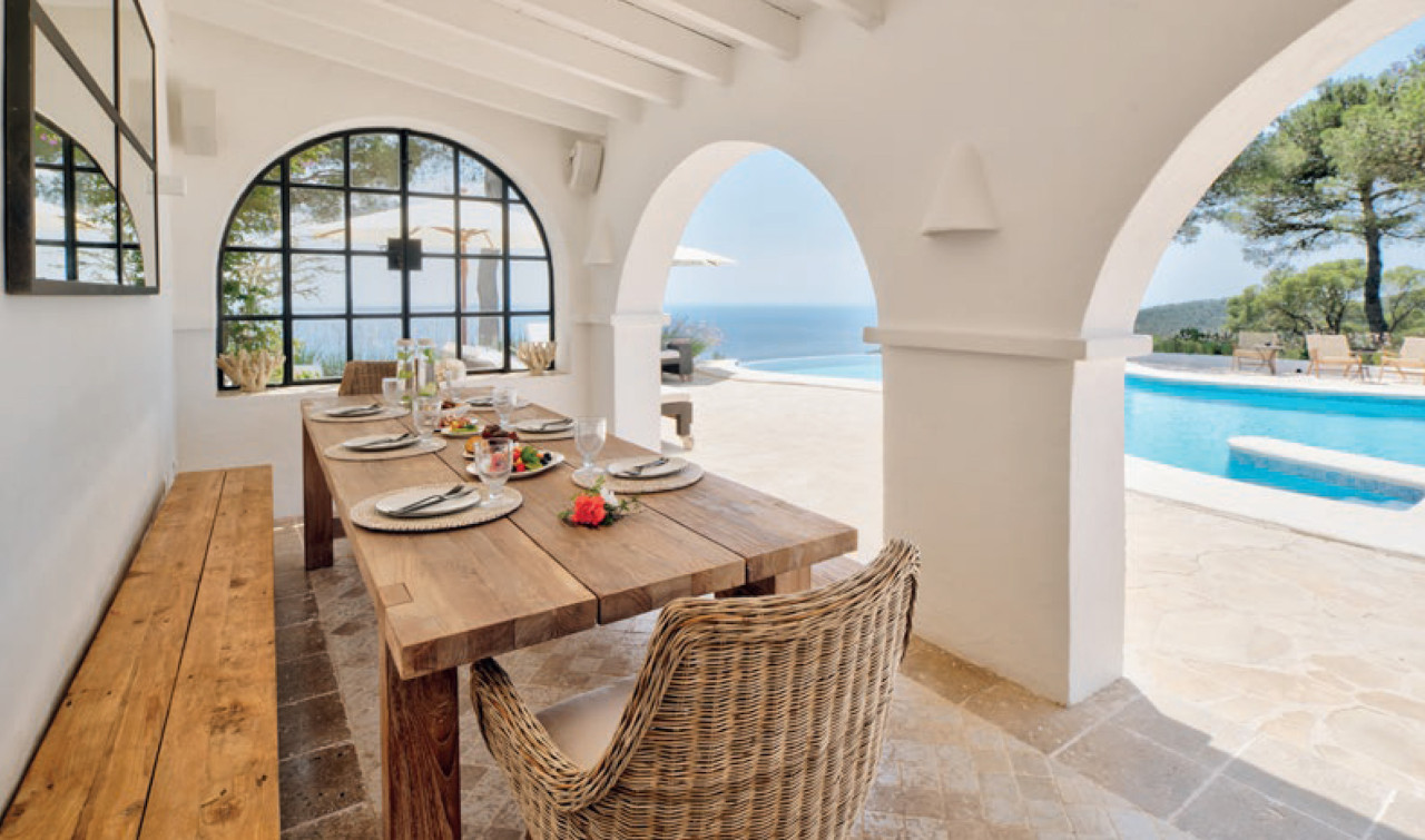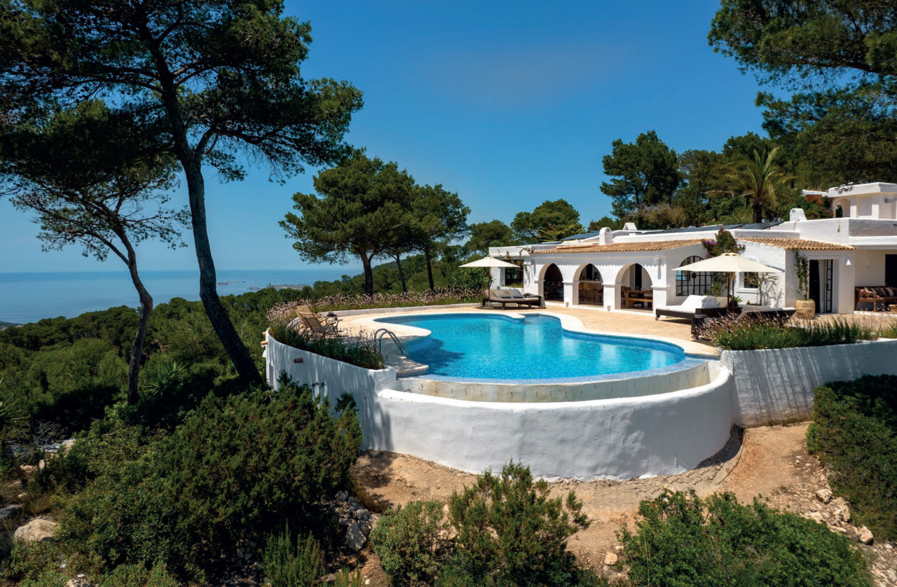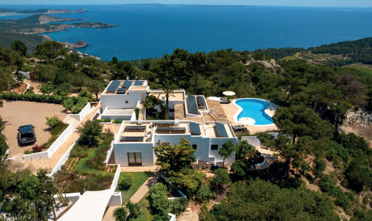 This breathtaking property is set 400 meters high, on one of Ibiza’s highest peaks, offering spectacular panoramic sea-views from Salinas to Cala D’Hort. Surrounded by a pristine pine forest, the perfect location to enjoy a peaceful holiday in a luxurious island home with breath taking sunrise and sunset views. The property is comprised of the main villa and a separate two-bedroom guest annex, both designed with the island’s classical architecture as focus, and with a unique setting providing one of the best 300 degree views on the island stretching from Las Salinas via Formentera and Es Vedra towards the Spanish mainland 170 km away on the horizon. The simple and classical style combines stylish contemporary living with an authentic Ibizencan style.